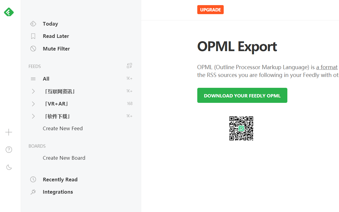 如果你是从其它RSS平台转移到「irreader」订阅,首先导出opml文件,如SoftGoing就在「feedly」平台里面导出RSS订阅opml文件,然后通过「irreader」导入。