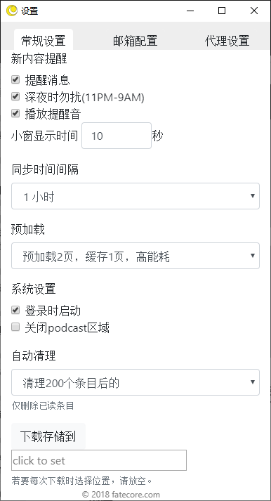 「irreader」一些设置功能,支持设置提醒的消息声音、同步时间间隔、预加载模式、自动清理条目,订阅邮箱通知、代理等。