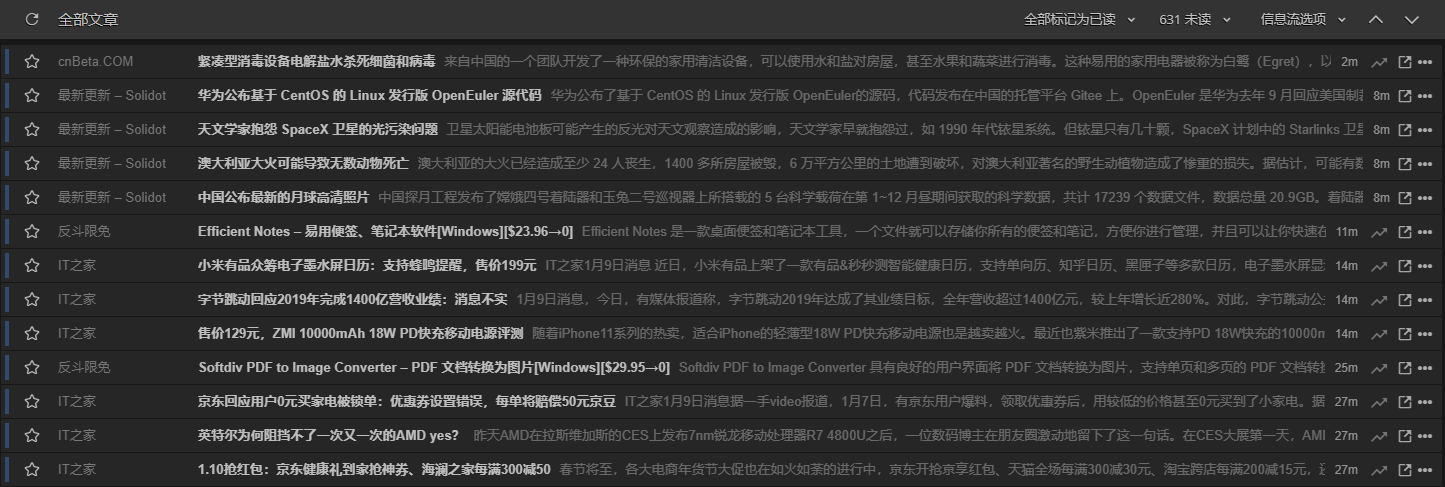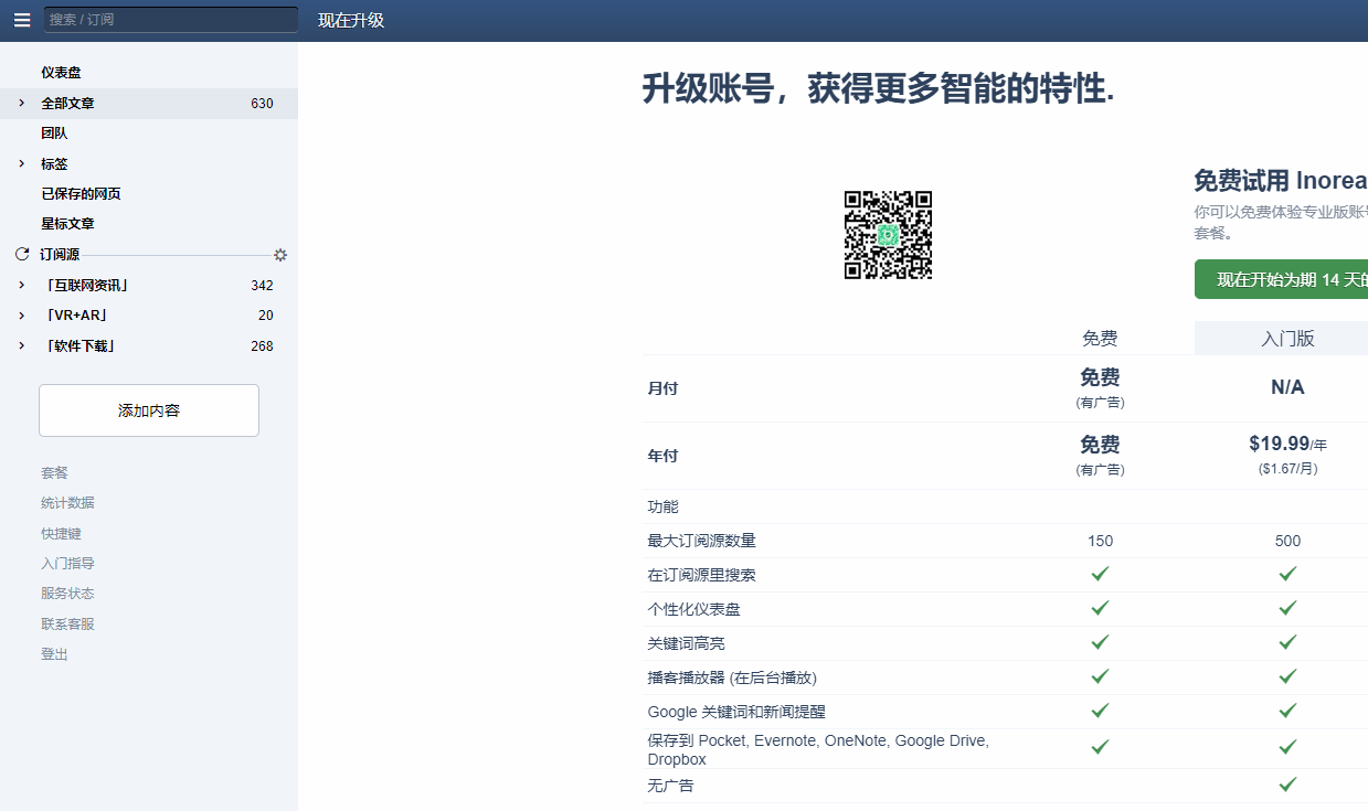 网友推荐的「inoreader」也是很慢,而且这两款免费版都有广告,还需要另外付费来解锁更多功能。