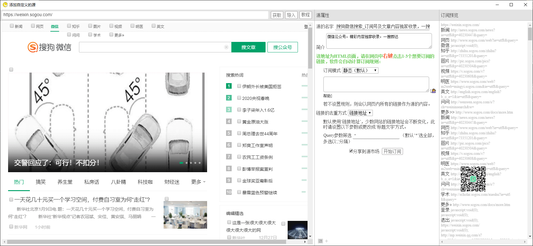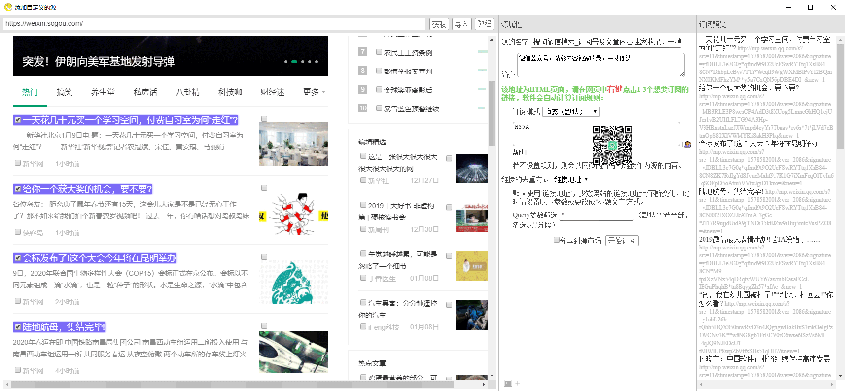 如果有些网站不支持RSS怎么办?用「irreader」的自定义规则功能同样可以订阅,例如订阅微信公众号热门文章,点击添加自定义的源码,输入https://weixin.sogou.com/ 网站,点击获取。