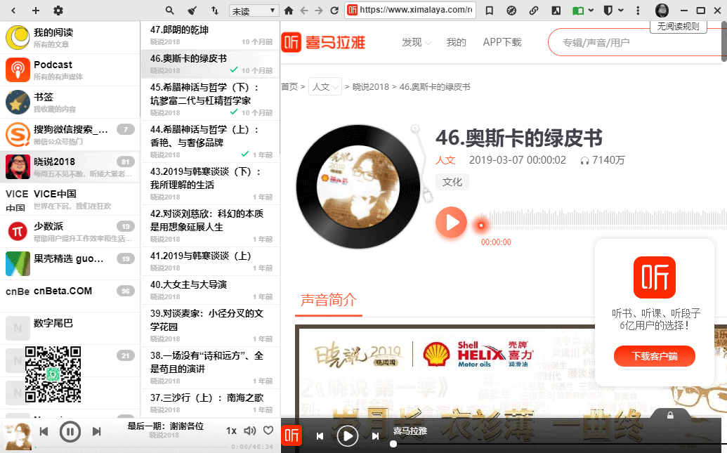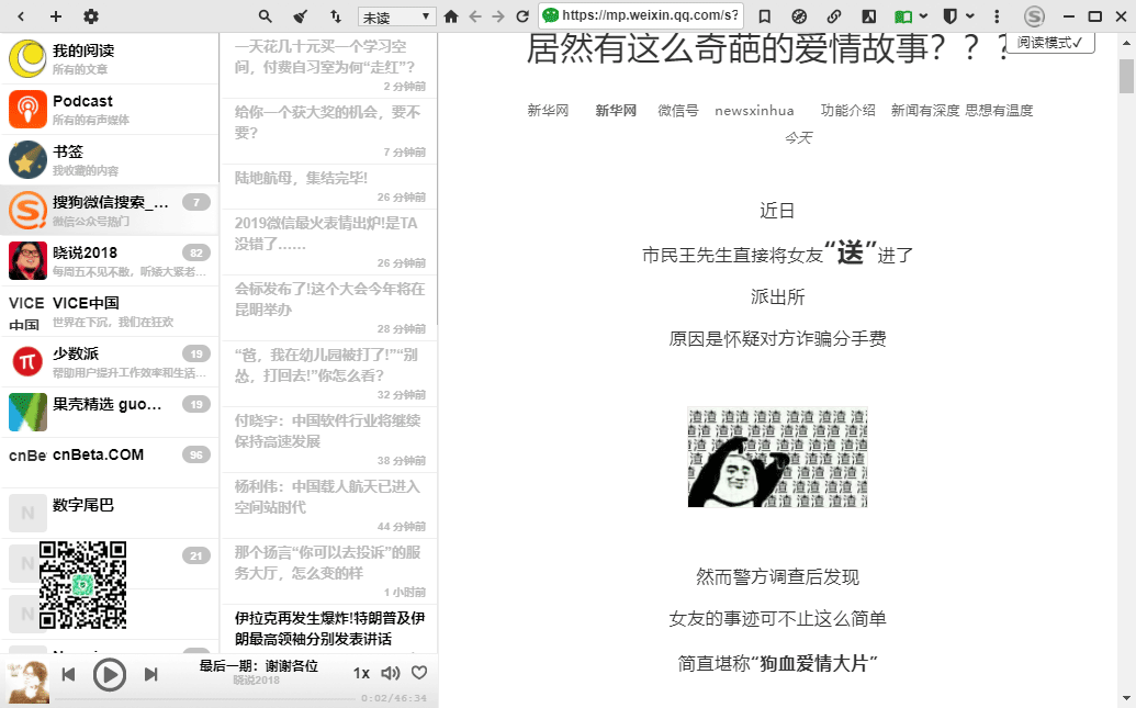 对于播客/音乐网站的订阅,可以后台播放。嗯,就可以边听,边继续阅读其它内容了。