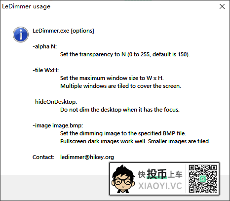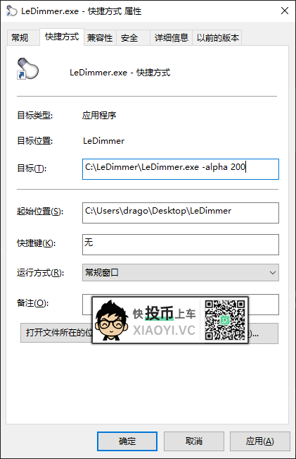 使用方法:在 “LeDimmer.exe” 快捷方式 的属性 → 快捷方式 → 目标,最后面添加参数,如:C:\LeDimmer\LeDimmer.exe -alpha 200