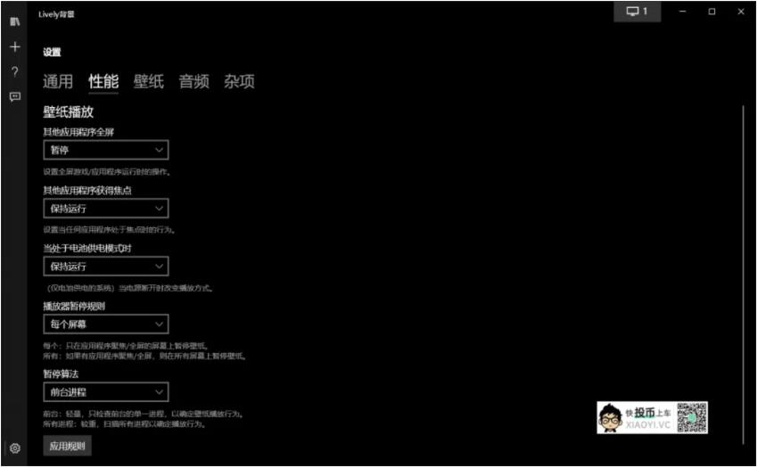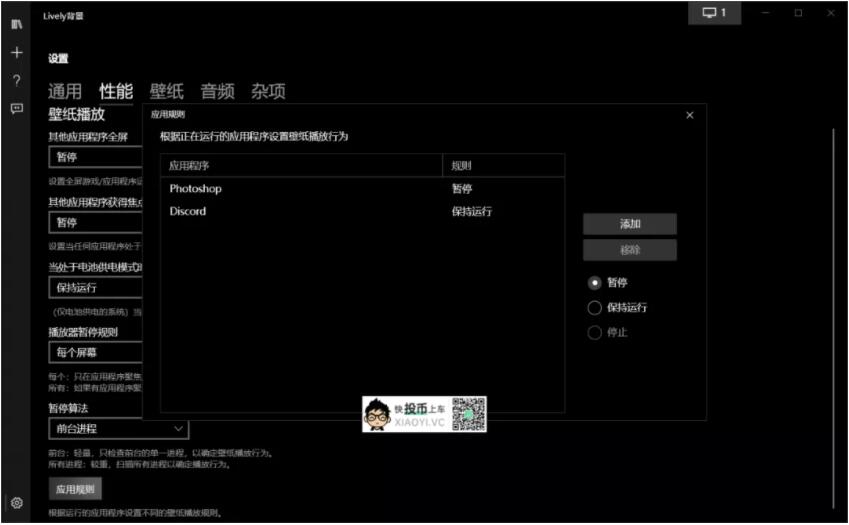 还支持设定应用规则,例如当你运行大型软件、大型游戏时,可以自动停止动态壁纸,避免占用资源,影响软件、游戏运行性能。