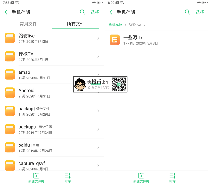 2.运行「骆驼live」后,就会在手机里面生成一个 “骆驼live” 的文件夹,再把直播源的文件(TXT格式)放到骆驼live文件夹里面去。可用手机自带的文件管理器操作,或装一个ES文件浏览器。