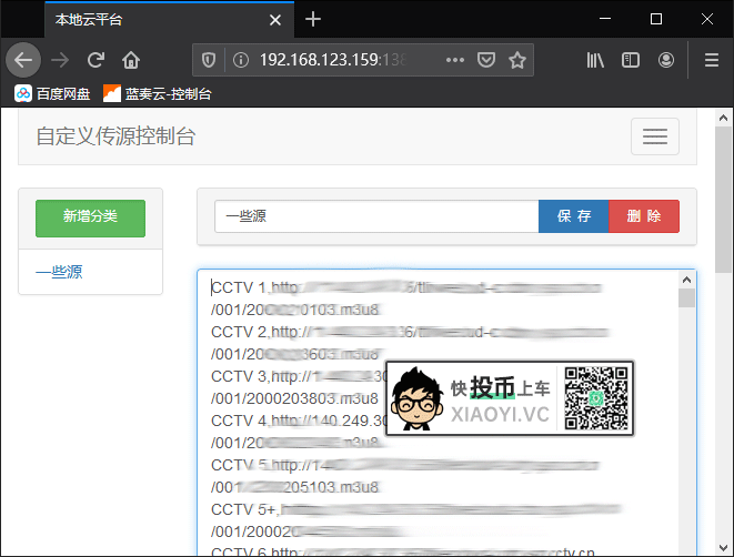 只要你的电脑/手机/电视盒子在同一个局域网内,浏览器直接访问IP地址就能管理源。可以新增/删除操作。