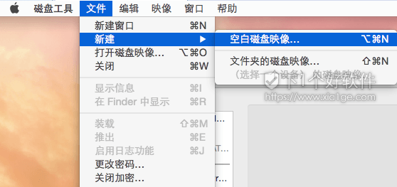 1.打开 LaunchPad → 其它文件夹 → 磁盘工具,菜单 → 文件 → 新建映像 → 空白映像