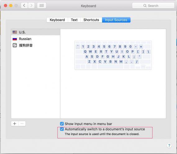 点击 输入源,在最下面有个一选项叫做 “自动切换到文稿的输入源” ,只要把它勾上。 这样输入法就会根据使用的程序自动切换。