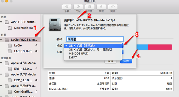 1.点击 LaunchPad → 其它文件夹 → 磁盘工具,在左边选中你的移动硬盘,点击上方的抹掉,选择你需要的格式即可开始格式化。