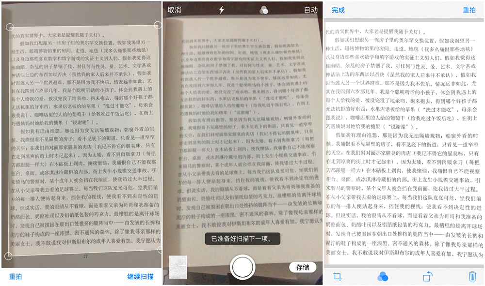 想要扫描多个文档,可以在 iOS 相机中选择继续扫描,重复以上步骤并记得保存即可。