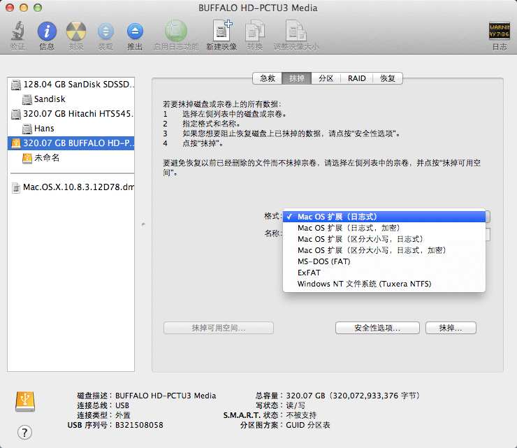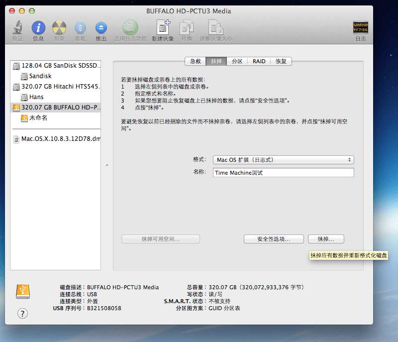 选择外置移动硬盘,Mac OS扩展(日志式) 点击“抹掉”,格式化!