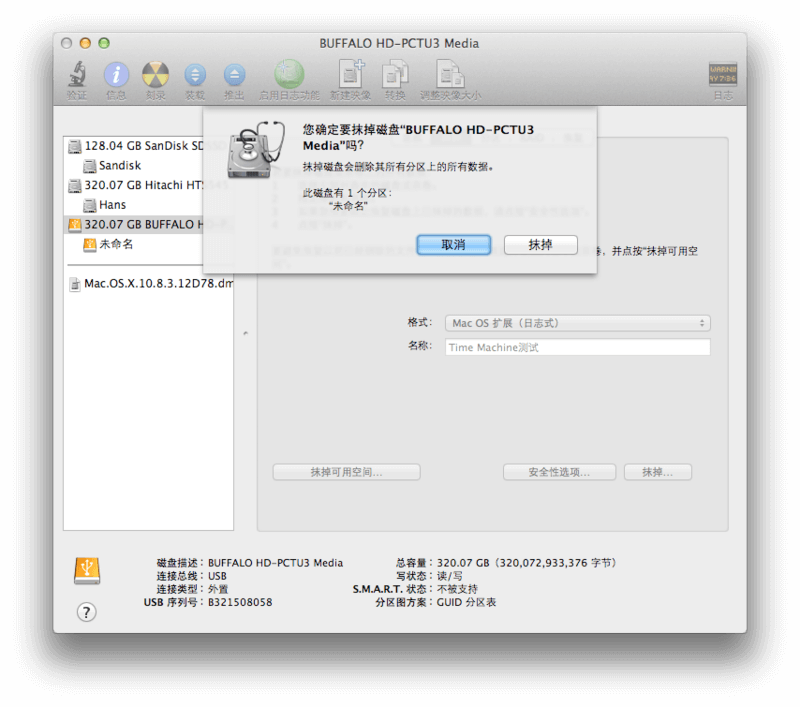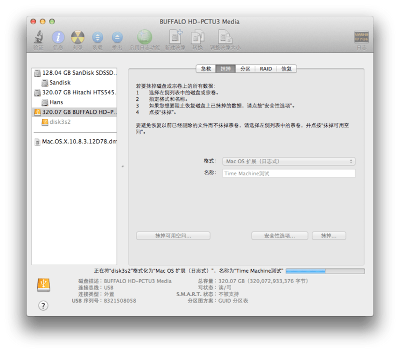 所以网上所说的用作Time Machine备份的磁盘会被清除数据就是在这个步骤清除的,格式化为Mac OS格式之后再开始备份是不会清除磁盘内的数据的