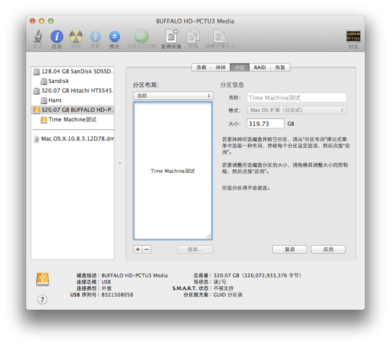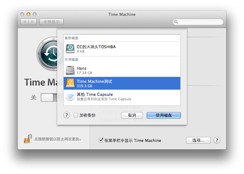 SoftGoing说明: 被用作Time Machine备份的磁盘格式一定是Mac OS扩展(日志式),否则不能用作备份磁盘