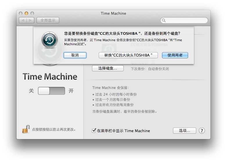 如果之前已经选择了一个备份磁盘,系统会弹出提示询问是需要同时备份到两个磁盘还是替换掉当前磁盘