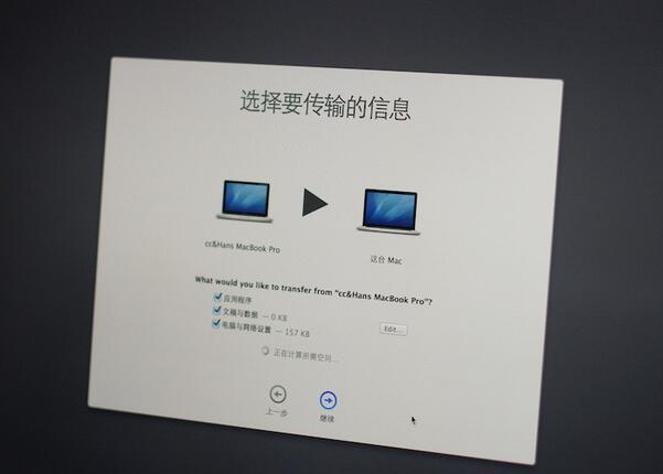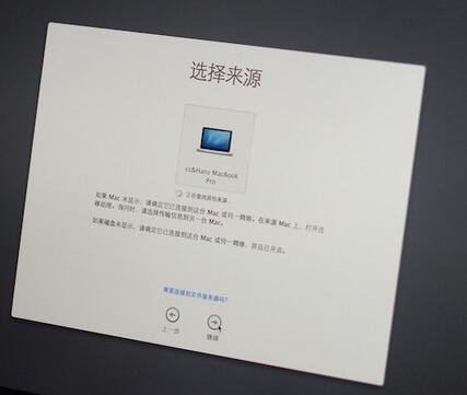 我们选择从Time Machine 导入,点击”继续“之后 系统会自动的寻找外置存储设备上的资料,下图中已经找到了之前mac电脑上的备份