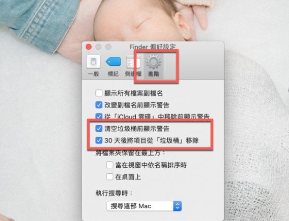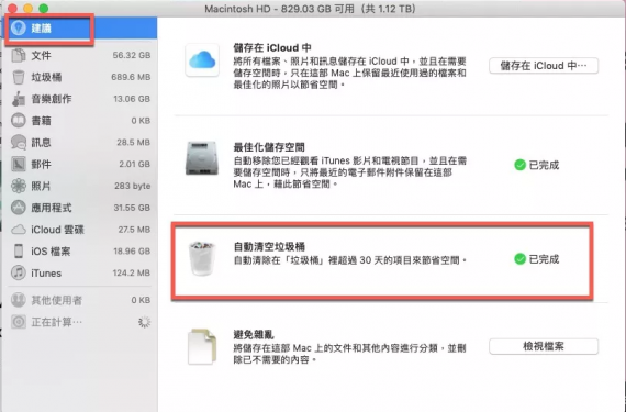 在进阶裡就可以看到「30 天后将项目从垃圾桶移除」,设定之后,就不用再手动清理,也不会为了忘记清理而弄满磁碟空间哦。
