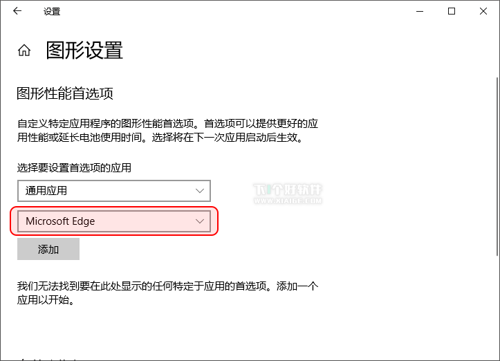 选择“通用应用”,在应用列表中选中“Microsoft Edge”,点击“添加”,Edge浏览器即添加到下面的列表中。点击“Microsoft Edge”项,即可显示“选项”按钮,点击即可打开“图形规格”设置。