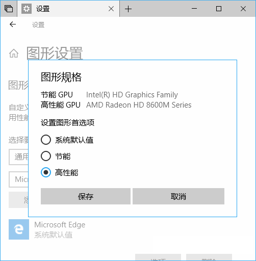 这里显示有节能GPU和高性能GPU,也就是你的PC配置的核芯显卡和独立显卡,下面的“设置图形首选项”默认选择的是“系统默认值”,你根据自己的需要选择“节能”或“高性能”即可。