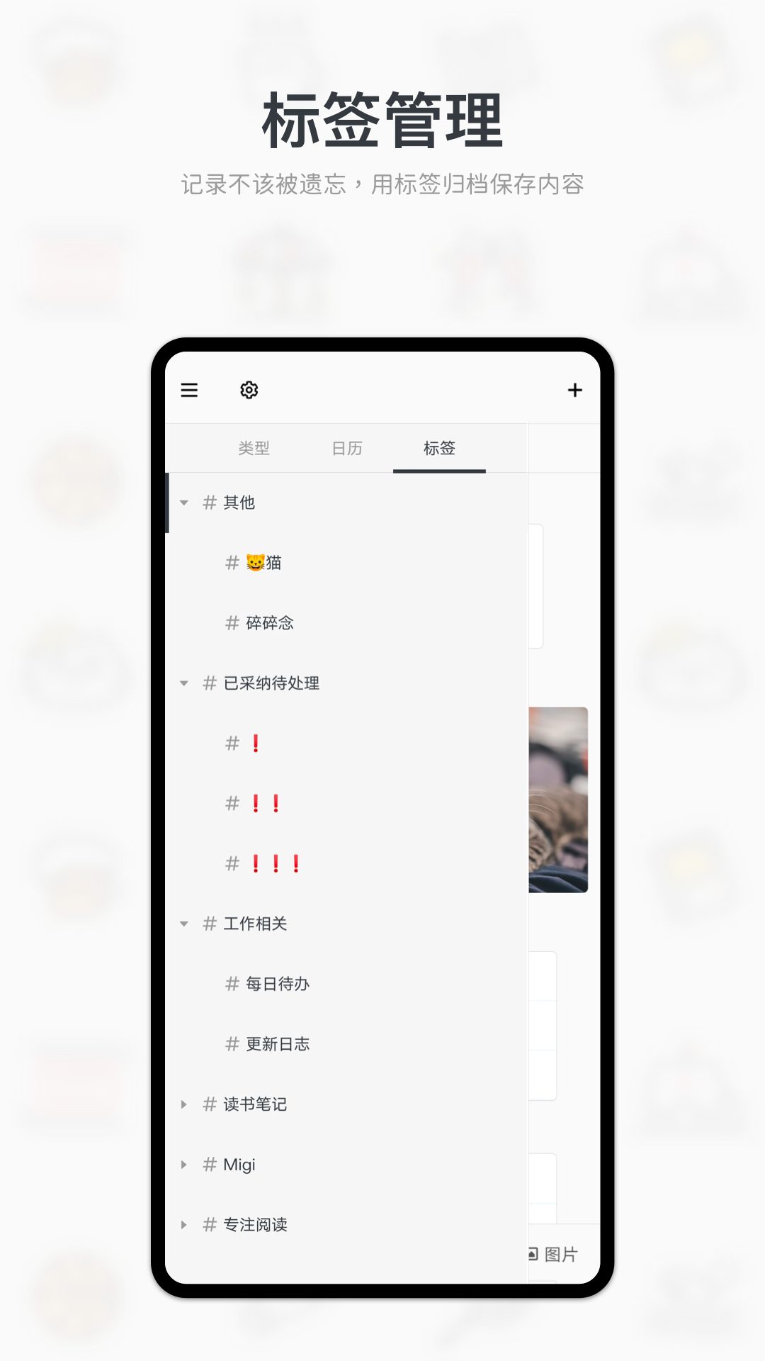 所有添加的内容,都会以创建的时间生成在时间轴上。以此减轻在记录的时候,总要思考内容归属的问题。将记录跟整理这两件事情解耦,更专注在记录当下这件事情上。