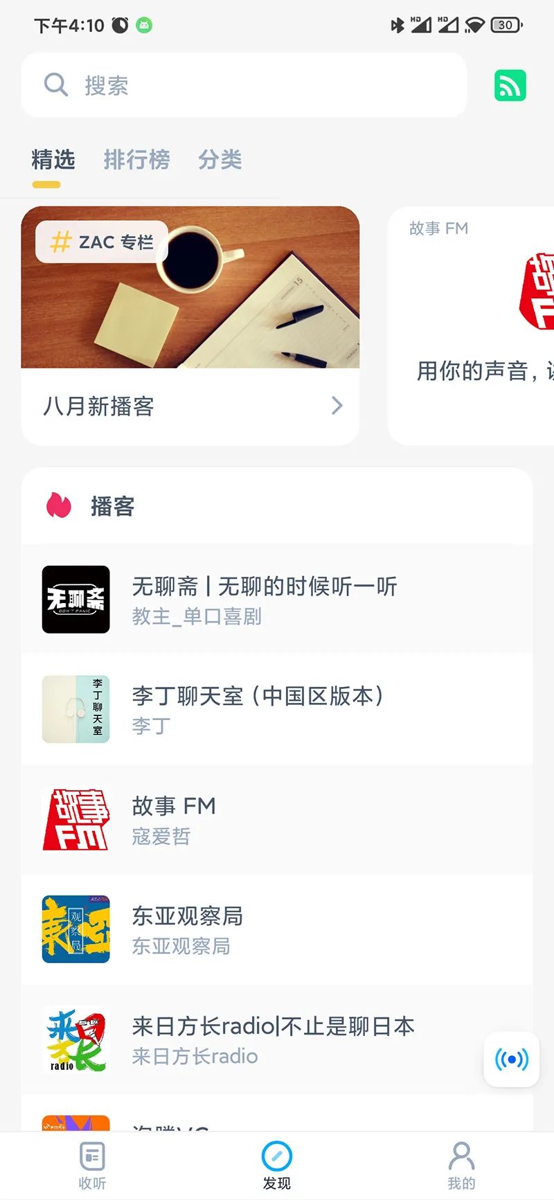 在首页采用了与微博一样的时间流表达方式,可按照单集节目排列用户所订阅的播客内容。