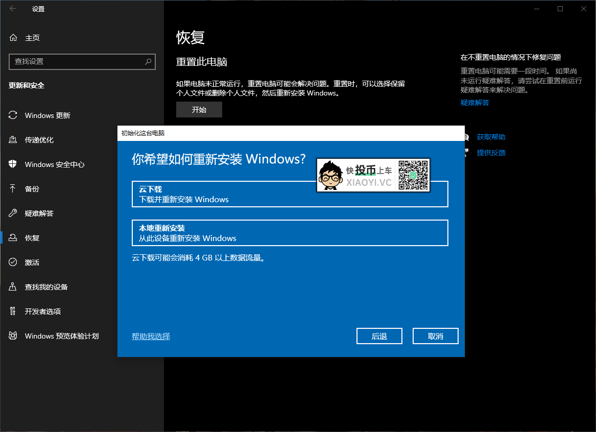 在设置 → 更新和安全 → 恢复,点击重置此电脑,可选保留文件,然后可让你选择 "云下载" 或者 "本地重新安装"。