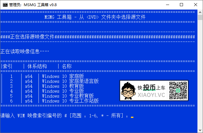 进入「MSMG ToolKit」主菜单后,接着输入 "1" 选择加载「Windows 10」镜像文件。