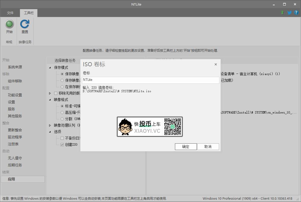11.开始生成「Windows 10」精简版镜像,勾选创建ISO,输入镜像名称确定,然后点开始,耐心等待。