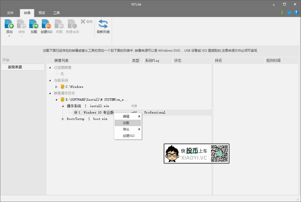 4.右键 Windows 10 专业版,点击加载。「Nlite」会进行挂载系统,耐心等待进度条走完。