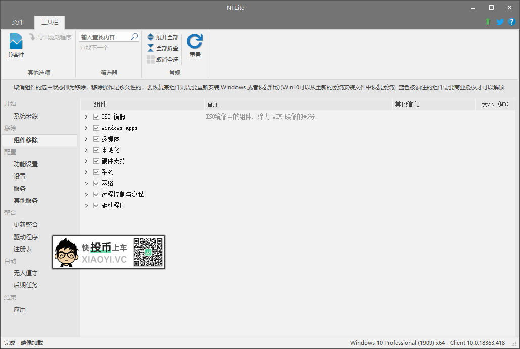 5.加载完毕后,在左边栏可以看到组件移除、功能配置、驱动整合、无人值守、以及服务和注册表等选项。