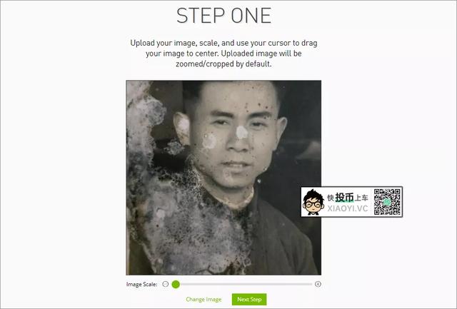 图片上传格式只支持 PNG 和 JPG,一般常见也这两种了,如果你是其它图片格式转换下格式就行了。点击 "Let's Get Started" 然后上传图片。下面SoftGoing随便找了一张老照片作为测试。