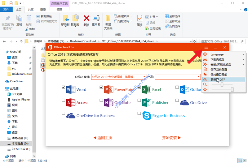 2.打开内置的Office Tool Lite后如果出现错误则点击右上角菜单选择更新至OTP,然后软件会自动进行升级。