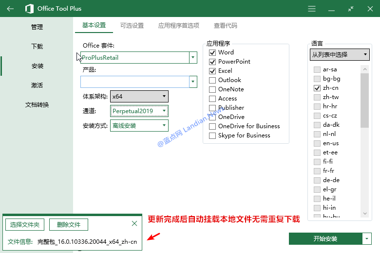 3.升级完成后打开Office Tool Plus工具点击安装选项即可看到如下图,自动挂载本地文件点击开始安装即可。