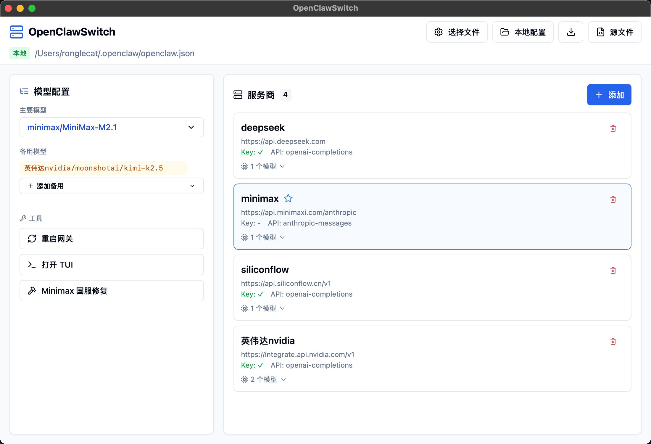 免费开源轻量级的 OpenClaw 配置管理工具「OpenClawSwitch」提供了 Windows、macOS 版本,基于 Tauri + Vue 3 构建。通过简洁直观的图形界面,让您轻松管理 AI 模型配置,无需手动编辑 JSON 文件。