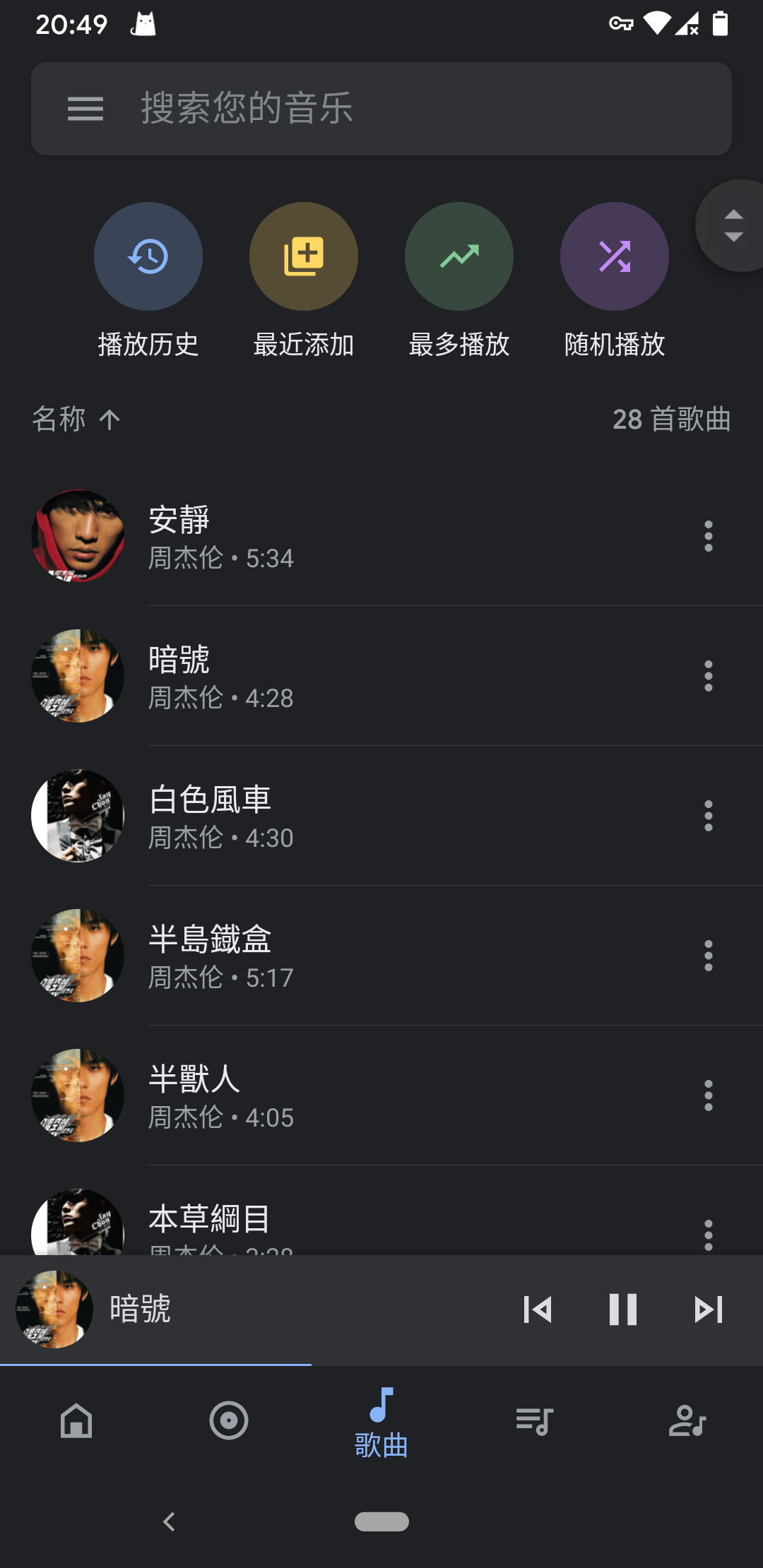 该应用获取文件媒体读取权限后可自动扫描手机上的音乐文件,打开APP后默认看到的主页是最近添加的歌曲信息,底部导航栏功能标签依次是主页、专辑、歌曲、播放列表和艺术家,每个功能标签页展示。