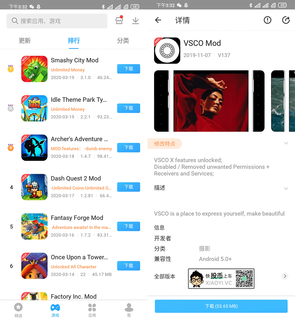 「Panda Helper」对于有MOD的APP应用会标识出来,页面也会有详细介绍MOD了什么内容。