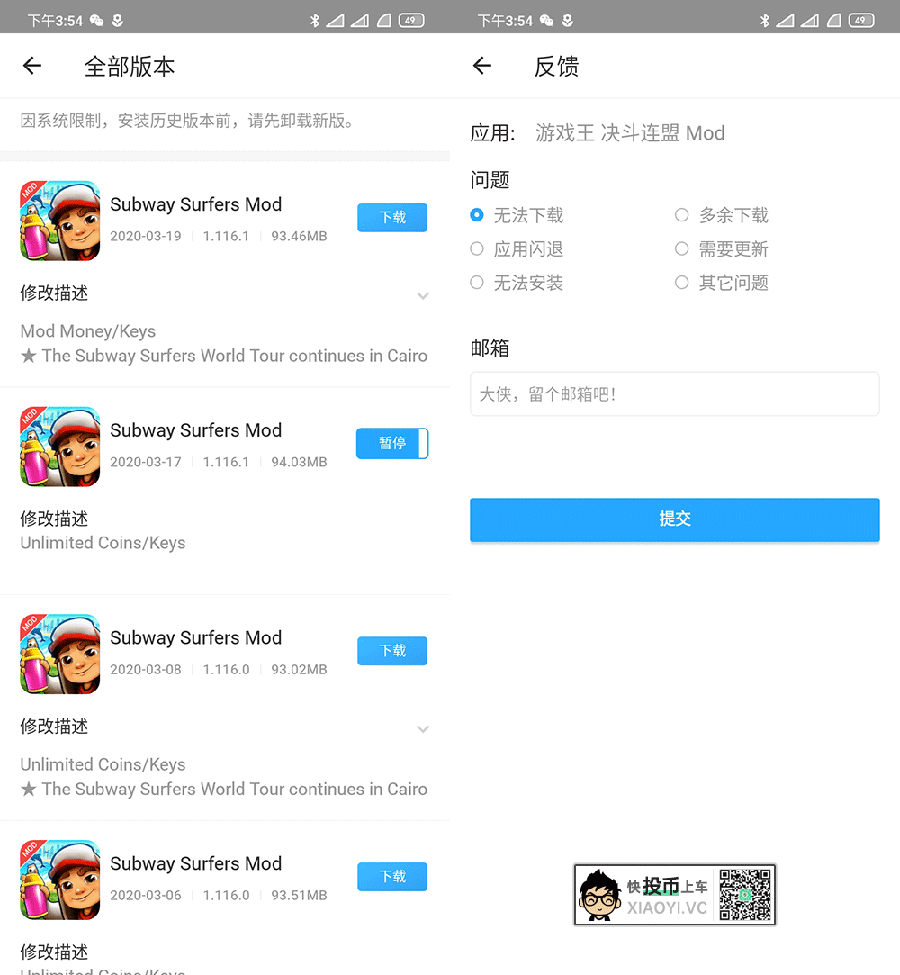 每个APP还提供了历史旧版本下载,遇到无法下载、安装的情况,也可以提供反馈,很贴心啊。