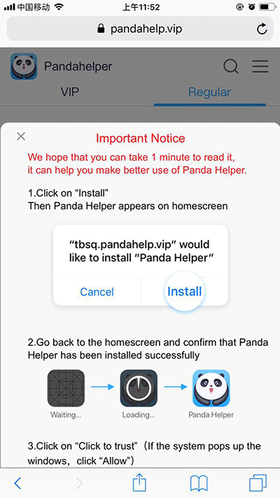 「Panda Helper」iOS版本分免费版和VIP版。浏览器「safari」输入:pandahelp.vip ,即可下载(下载免费版可以切换到Regular页面,默认是VIP版的)。