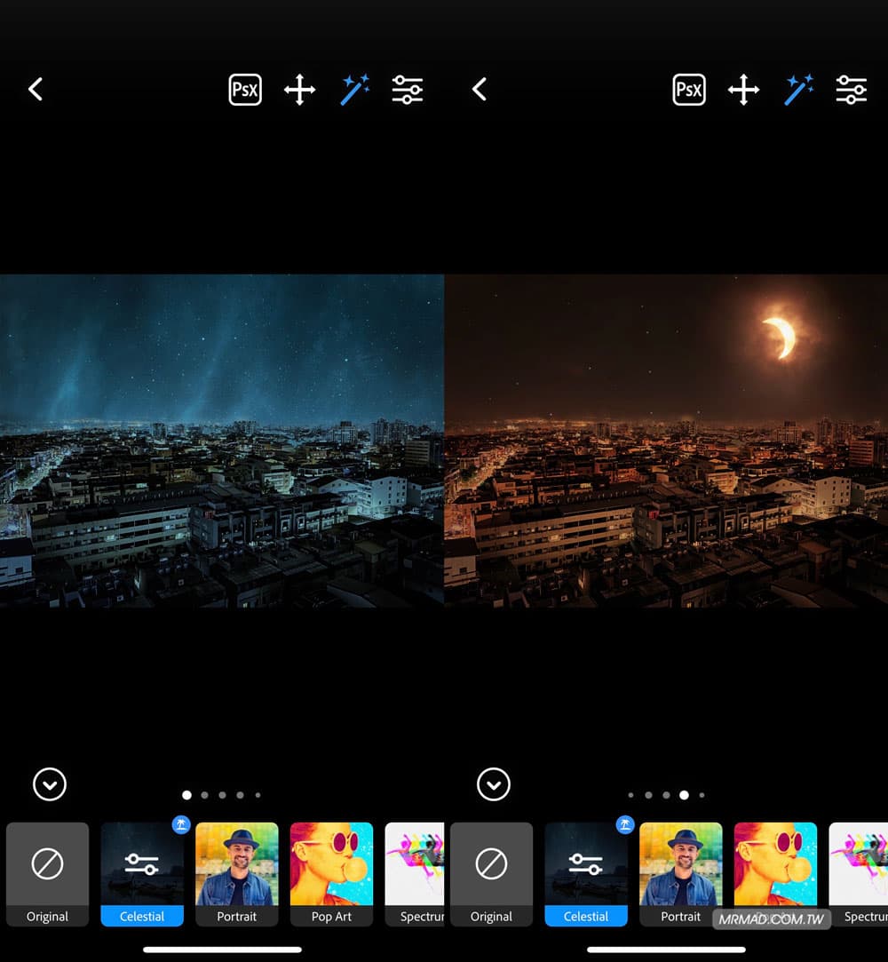 比较有意思的滤镜,可以把黑夜变成星空效果,不管你的照片是白天还是黑夜拍的,都可以通过滤镜变成星空图,这下可以发朋友圈装X了。
