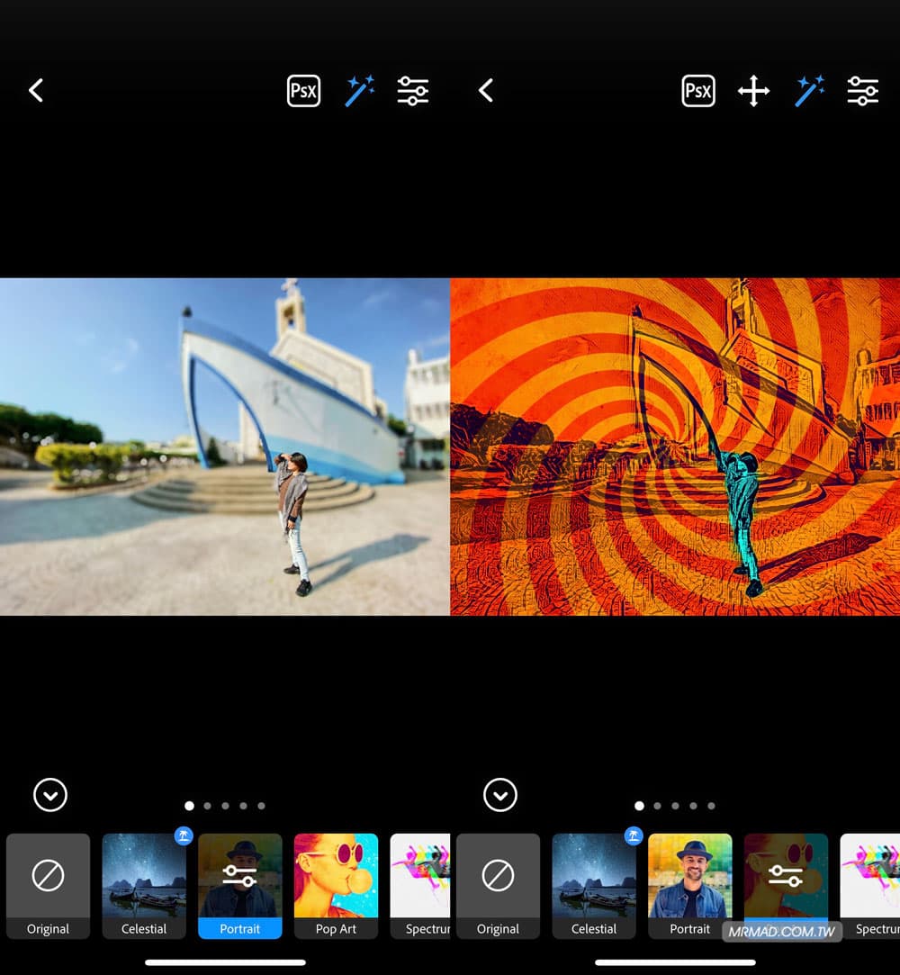 「Photoshop Camera」除了滤镜功能,主要亮点是使用 Adobe Sensei AI 人工智能技术优化,例如天气不好,拍摄出来的天空灰蒙蒙,这项技术可以自动分辨出天空,然后智能抠图给你换一个蓝天空、还可以自动调整亮度、色彩等。下面来看一些作品。
