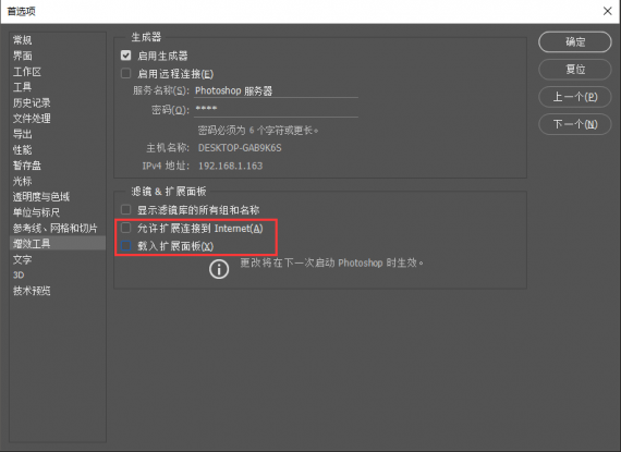 解决方法:在 Photoshop → 首选项 → 增效工具 →把 允许扩展连接到 Internet 和 载入扩展面板,给关闭了,之后重启 Photoshop 就能解决。启动 Photoshop 速度也会快一些了。
