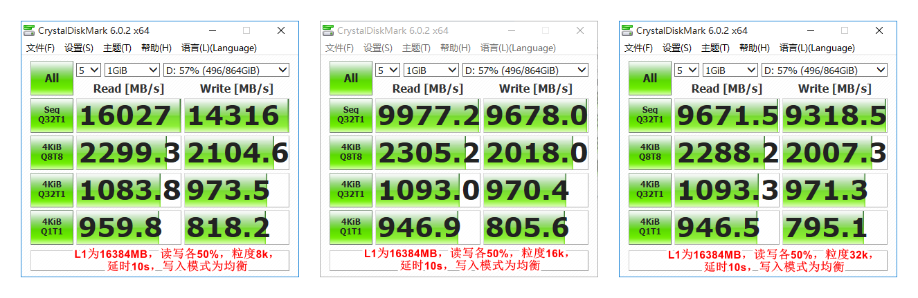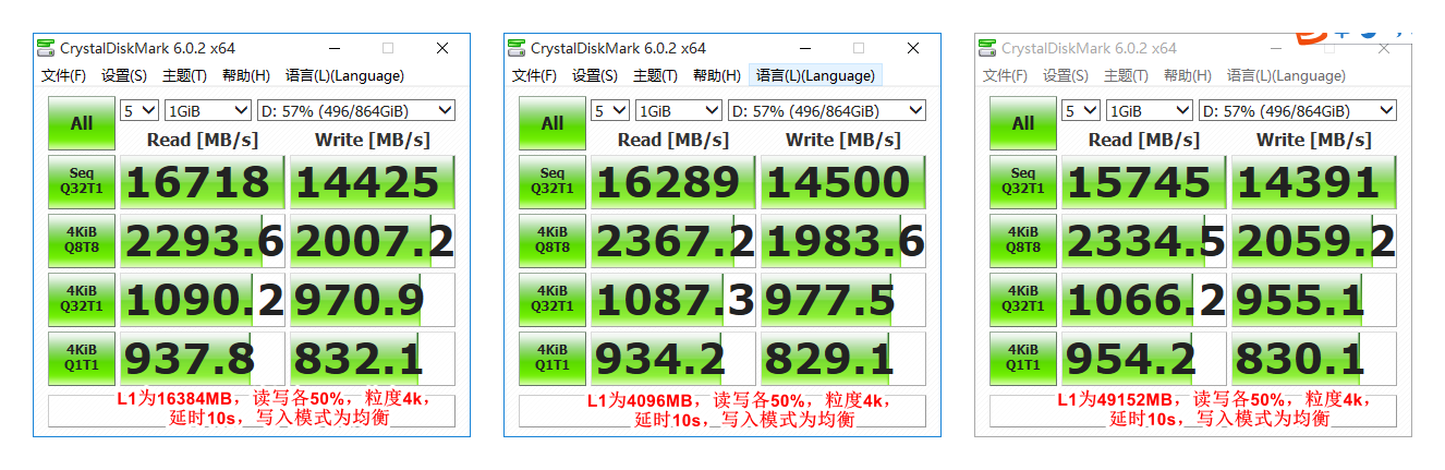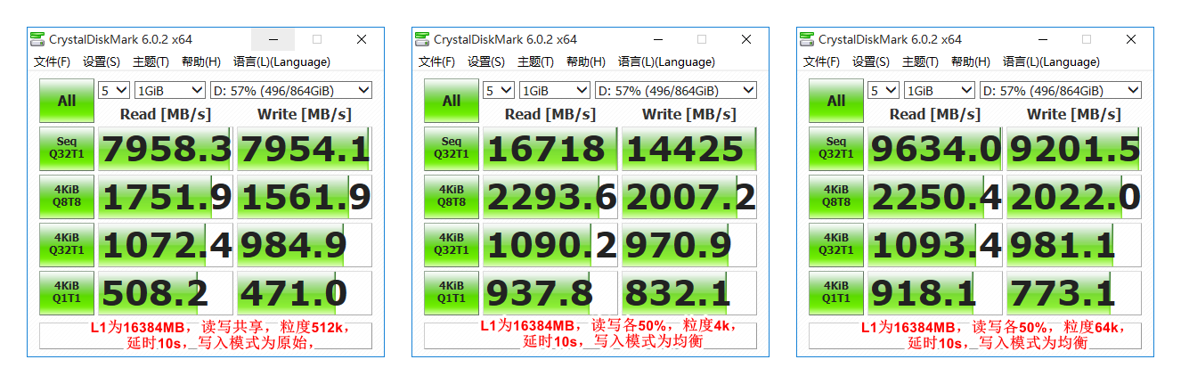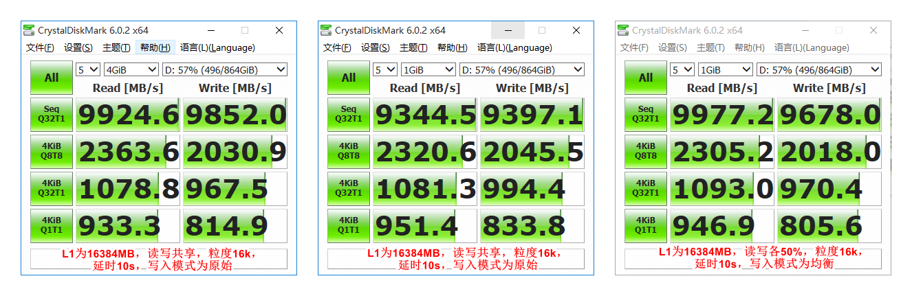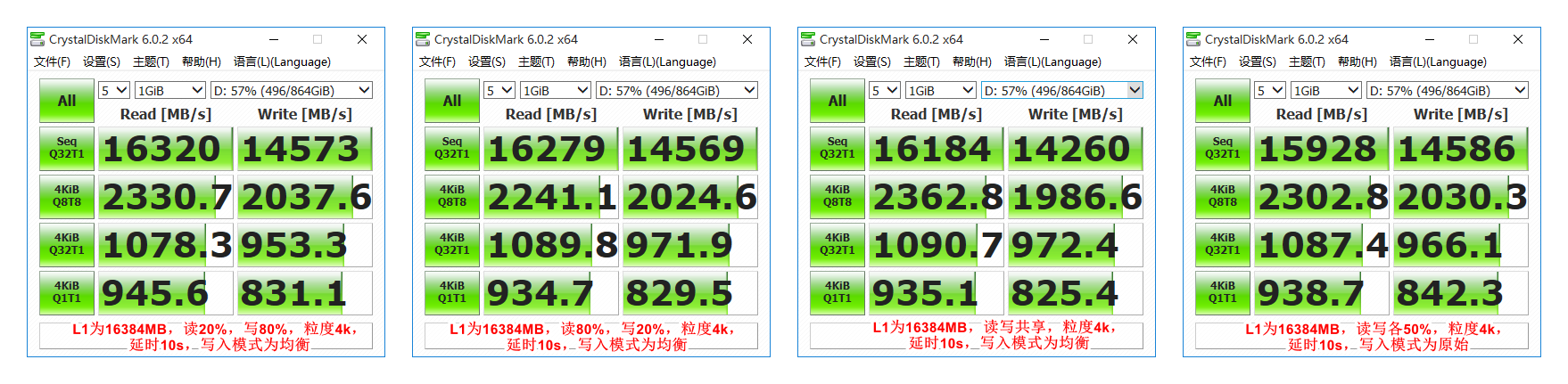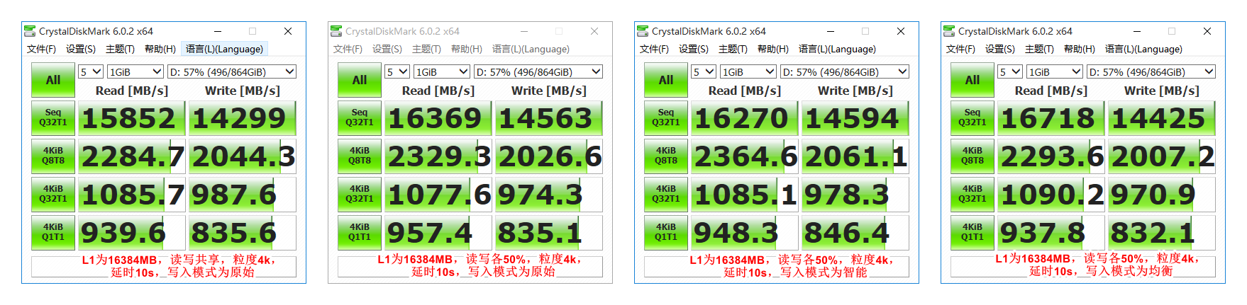 4、缓存粒度为16k,其他设置不同时的影响:可以看出,影响不大,写入模式为均衡时稍微好一点点,“读写分开”比“读写共享”稍微好一点点。