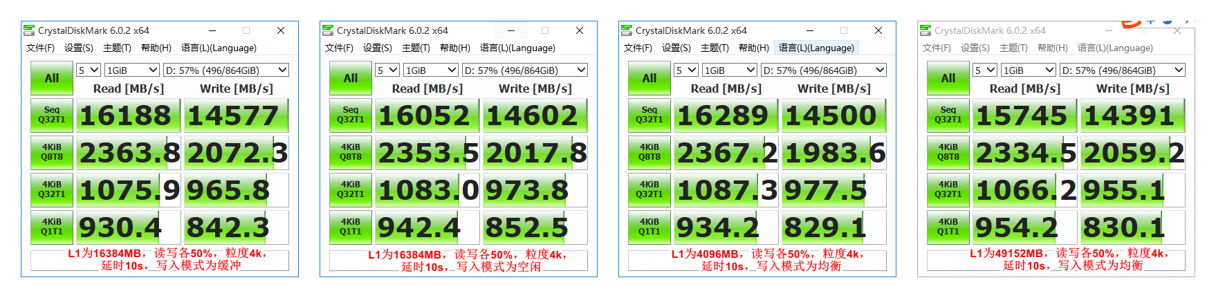 3.缓存粒度为4k,其他设置不同时的影响:可以看出,影响不大,写入模式为均衡时稍微好一点点。