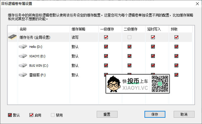 3.目标逻辑卷专属设置,可以对磁盘进行设置读写策略。小内存用户建议仅读,避免内存满了不够写入数据。