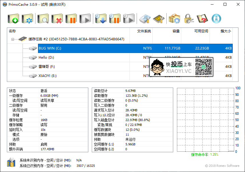 使用「PrimoCache」不管你是低配置电脑,还是高配置,用内存缓存,除了可以提速外,毕竟内存比SSD快的多,还能应付硬盘日常的频繁读写,提高硬盘寿命,极大降低固态硬盘掉盘概率。