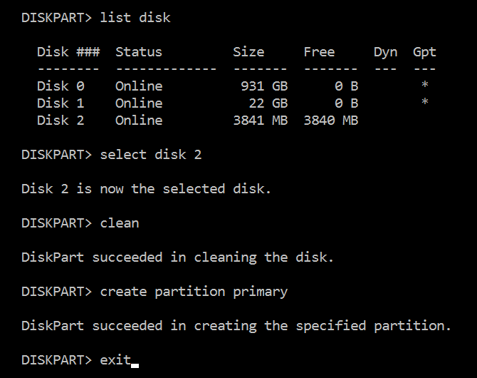 - 输入create partition primary给U盘所有未分配空间创建主分区