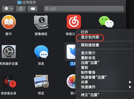 1、进入应用程序文件夹,找到迅雷并右键选择显示包内容,