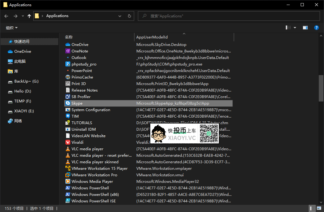 shell:Appsfolder\例如:shell:Appsfolder\Microsoft.SkypeApp_kzf8qxf38zg5c!App。然后给「Skype」添加一个图标就行了。