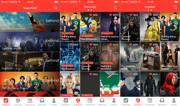 打开SeenIt登录后首先看到的是所有追踪记录,你还可以通过Discover(包括趋势与流行两个标签)来获取更多美剧,