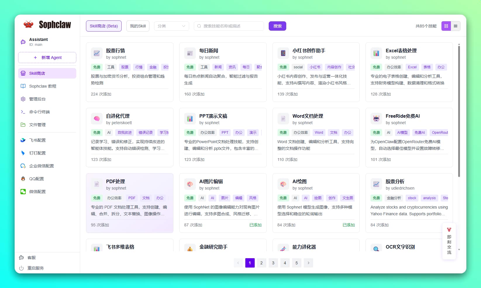 SophNet 是算能自研的一站式模型推理 API 服务平台,支持多种 AI 模型和算力设备接入,提供低代码开发工具,适用于从简单 API 到复杂 Agent 智能体的构建。目前也上线了「Sophclaw」 一键部署 OpenClaw 小龙虾,可养成的私人AI助理,越用越懂你、越用越好用。目前 Sophclaw (小龙虾) 已顺利打通微信、飞书、钉钉、QQ、企业微信等主流 IM 渠道。