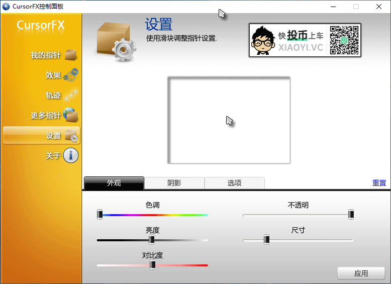 如果你对软件提供的鼠标样式还有不满意的,还可以在“设置”选项当中进行细微的调整,包括设置阴影、锐化、热键等。