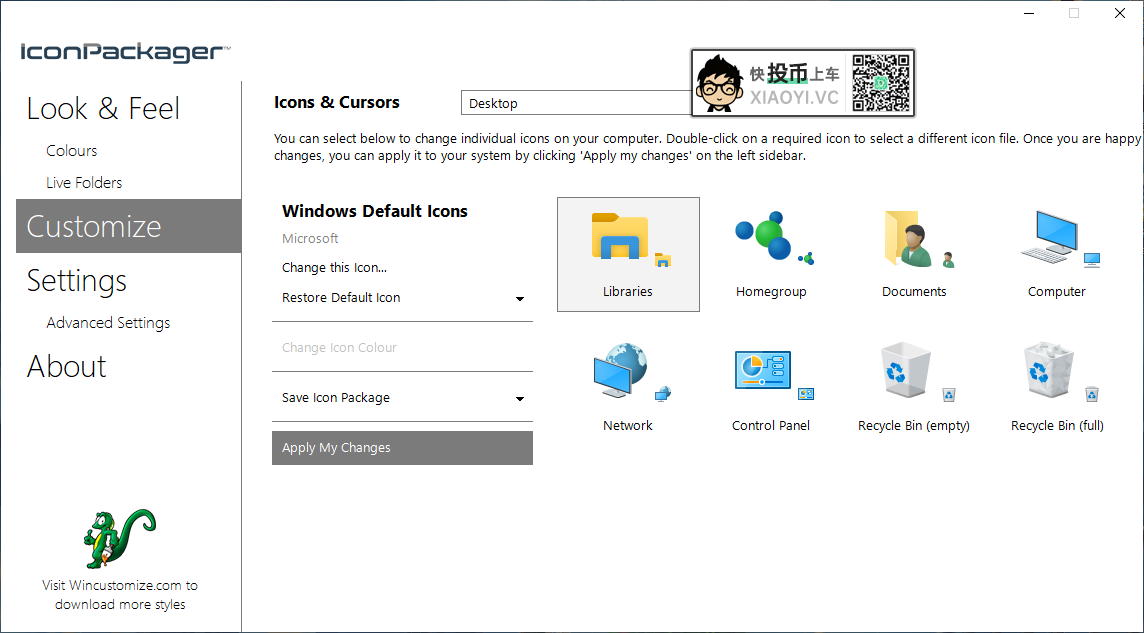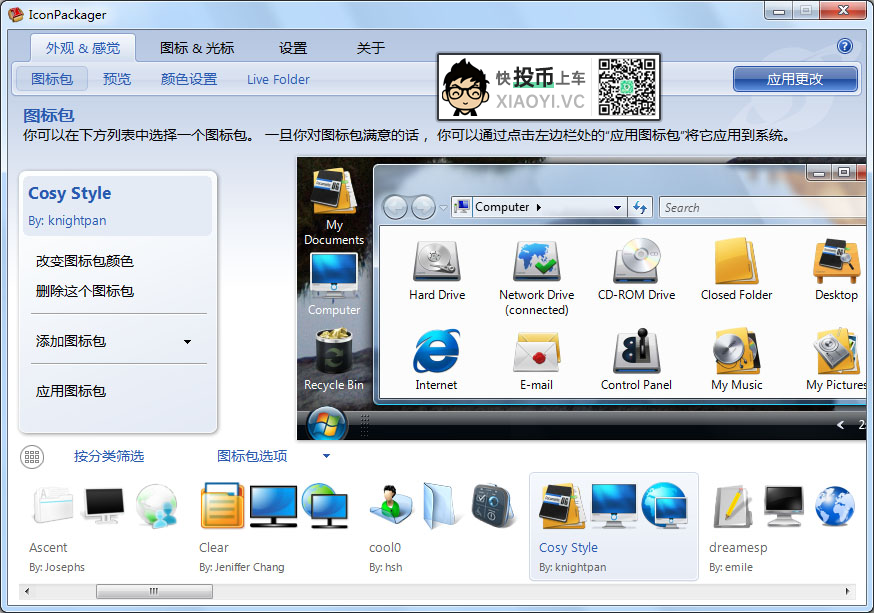 「IconPackager」主要对系统图标进行美化,可以替换系统程序,文件,系统文件上的图标。除了可单独挑选自己喜欢的图标更换外,也可一次套用整个图标主题更换。